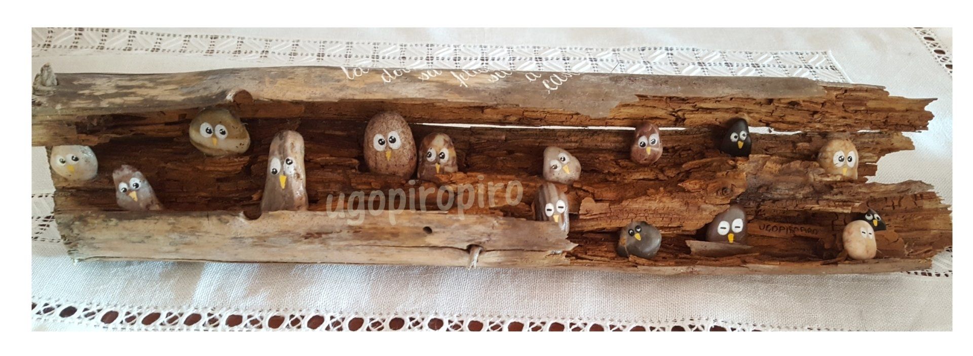 Condominio di gufetti realizzato con legnetti di recupero e sassi decorati
