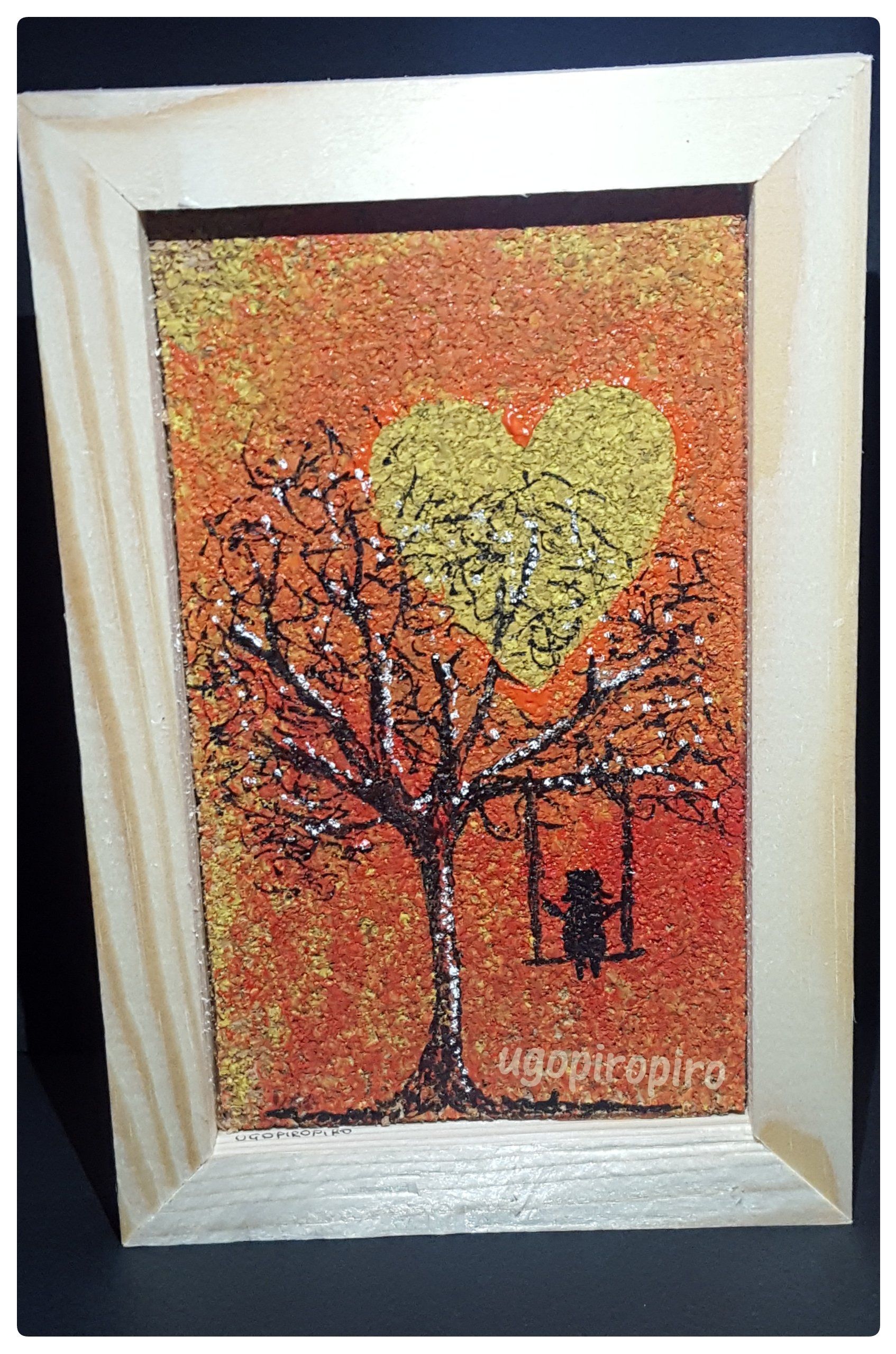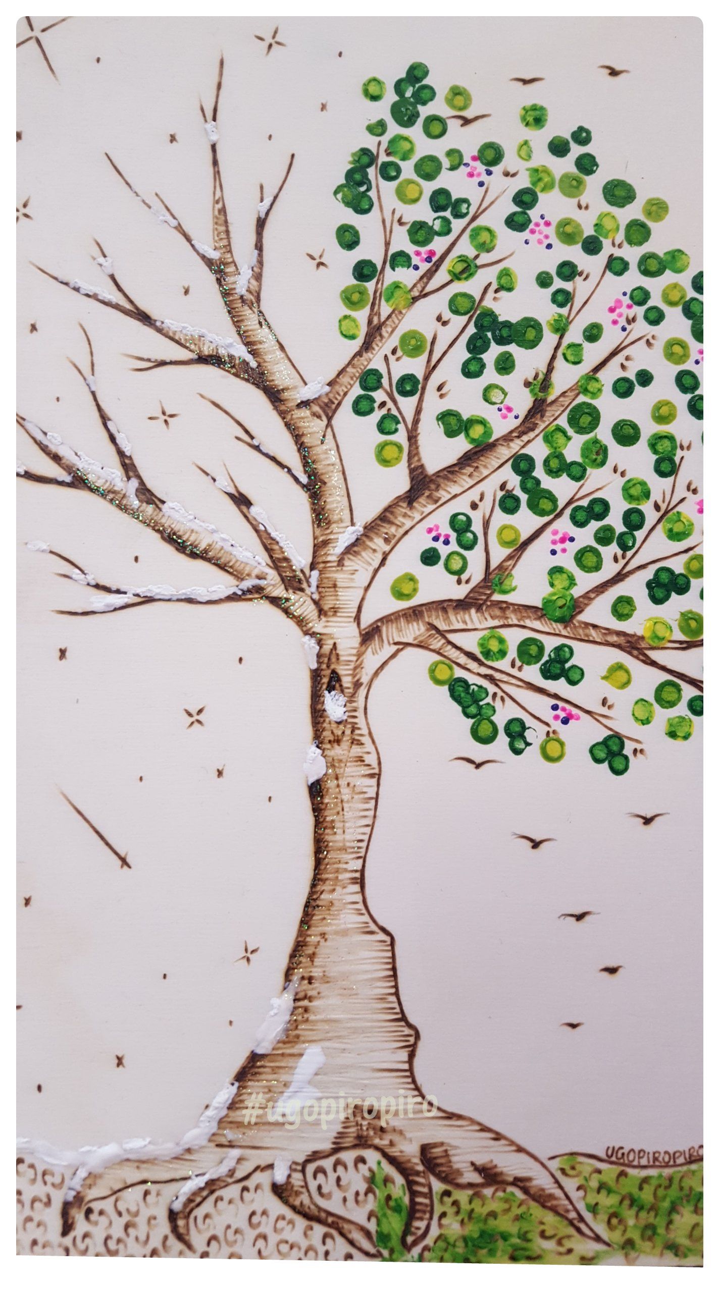 Albero della vita pirografato su compensato di pioppo con aggiunta di acrilico. cm 20x15