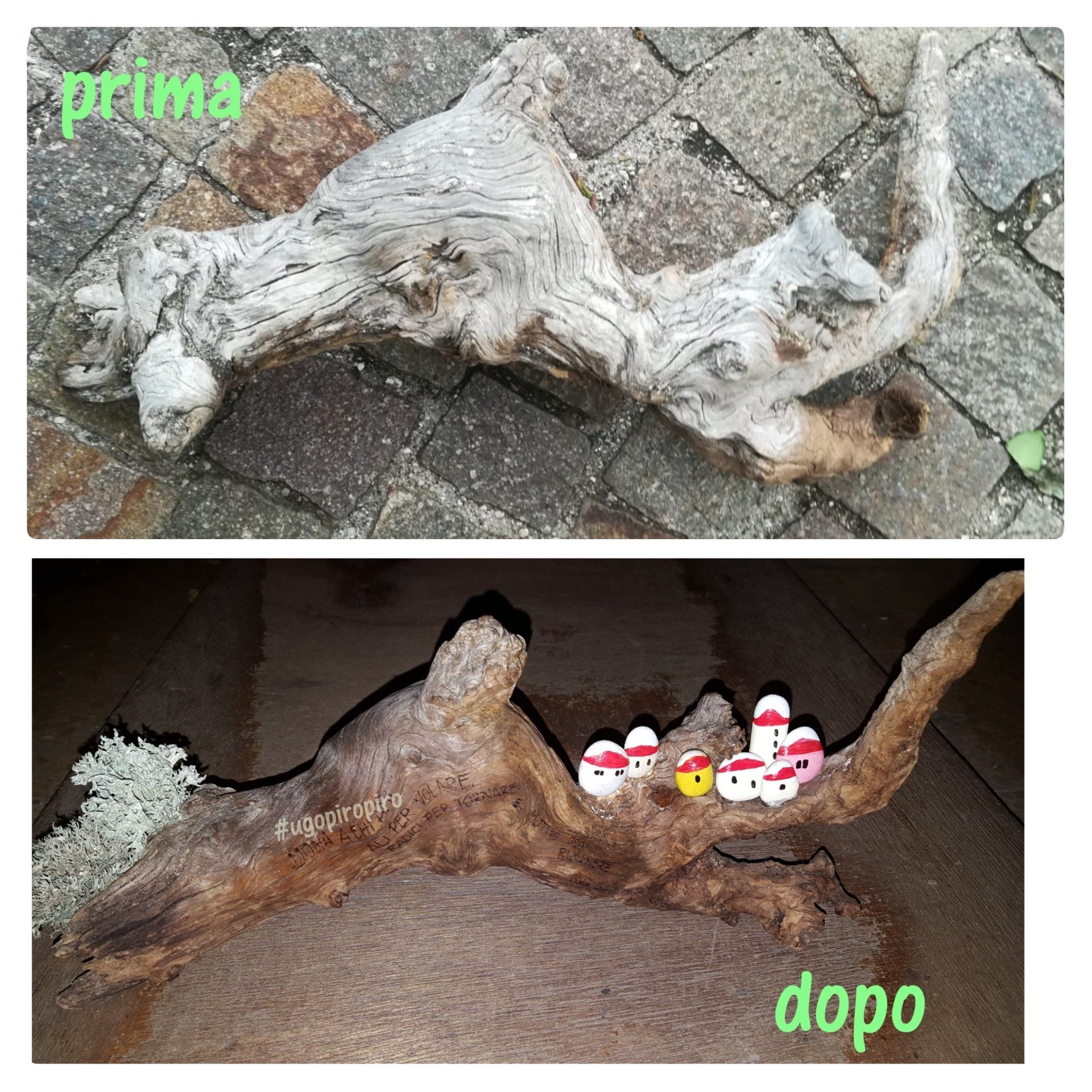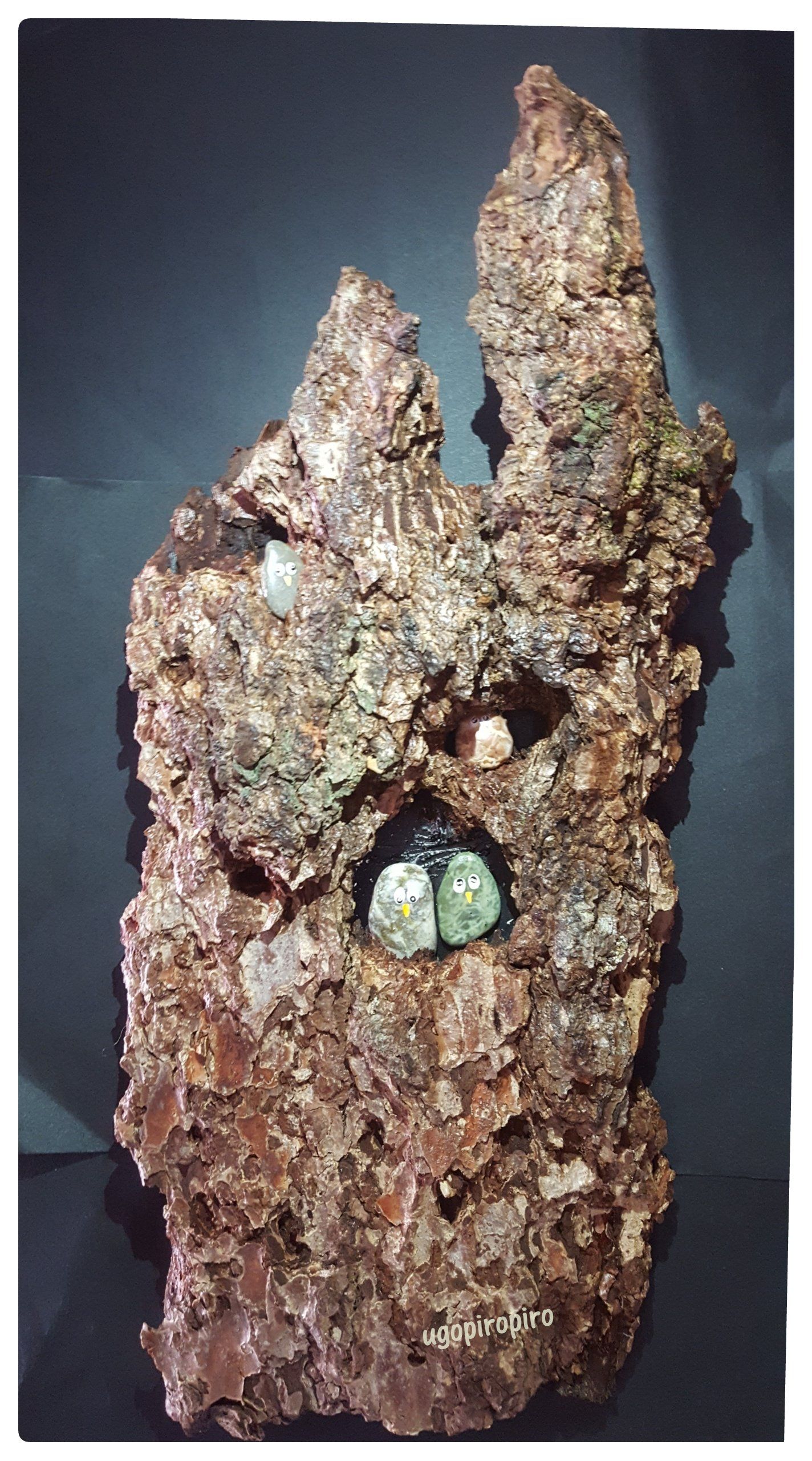 opera realizzata con sezione di corteccia e sassi decorati cm 40x 15 circa