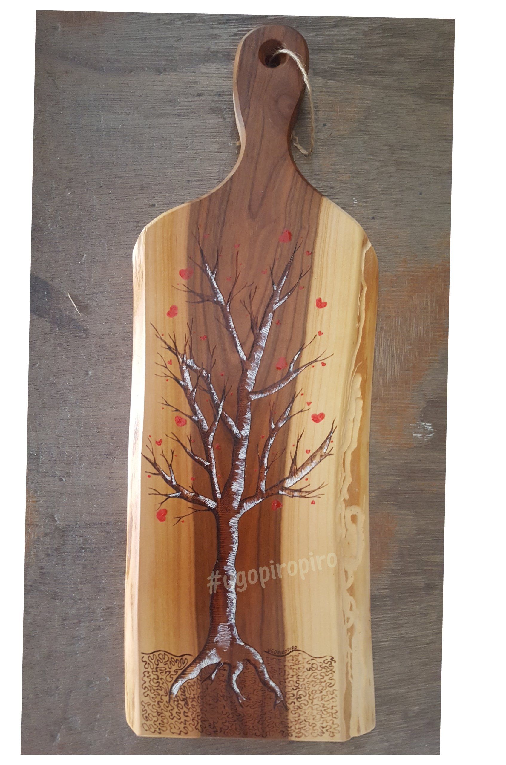 Albero della vita pirografato su u tagliere fatto a mano con legno di noce, con aggiunta di acrilico. cm40x15