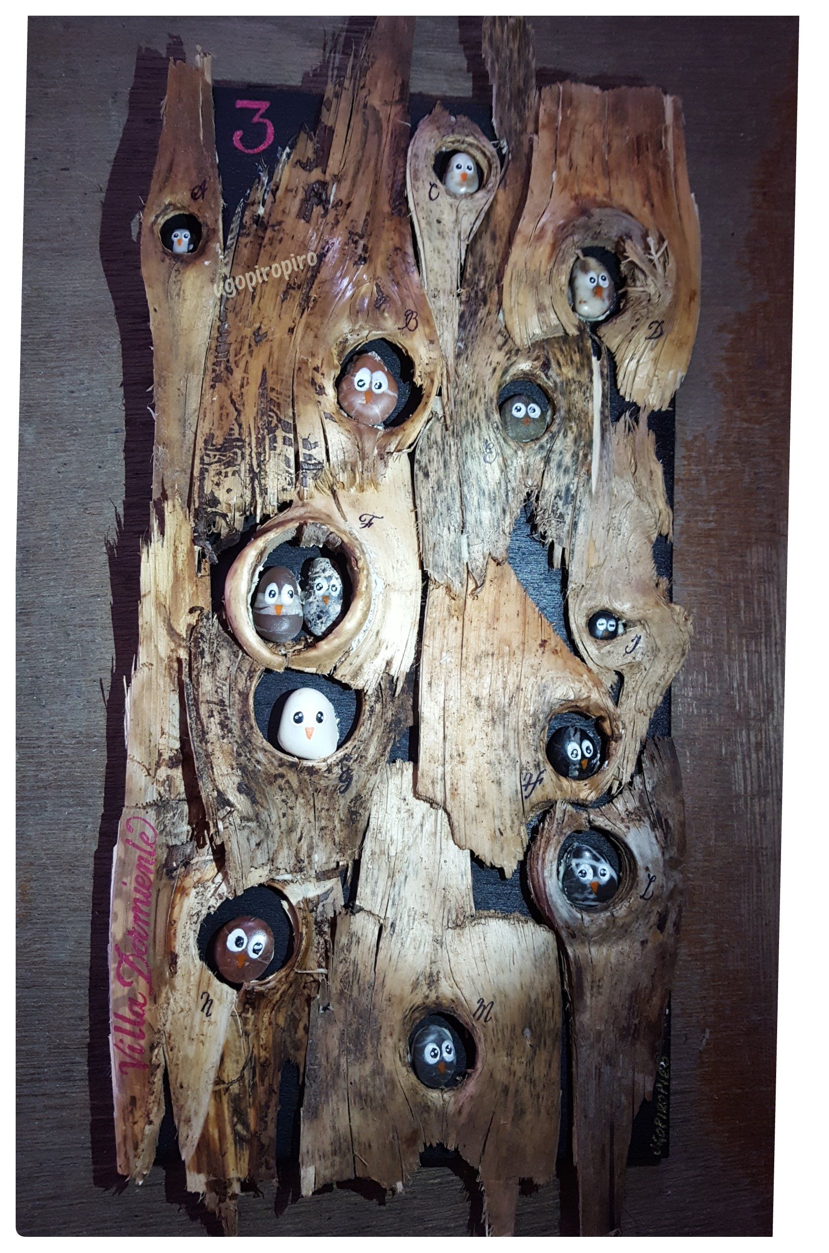 Famiglia di gufetti irrispettosi in un legno di recupero cm 30 x 10 circa
