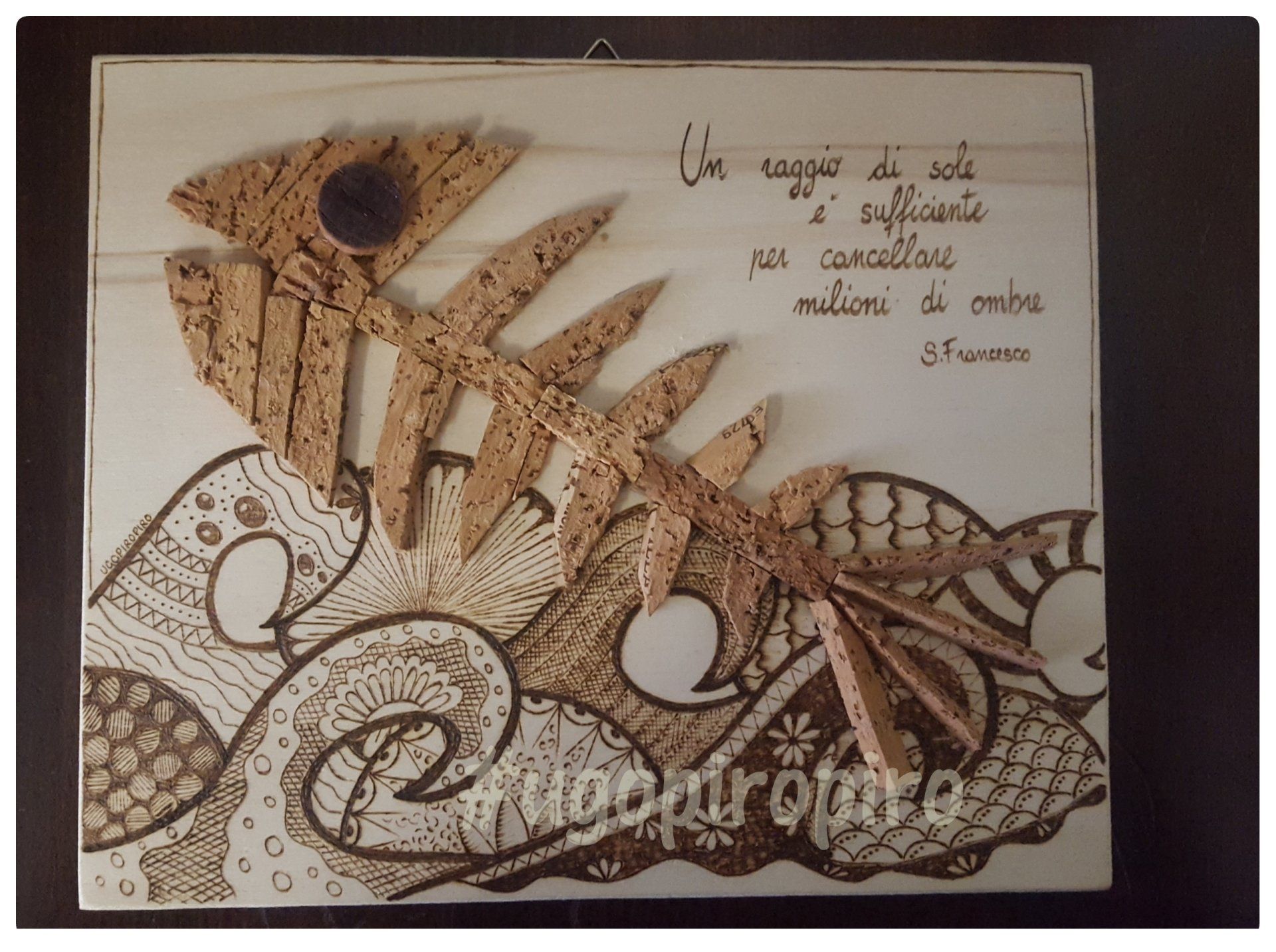 pirografia su compesato di pioppo con sughero e citazione di S.Francesco cm20x15