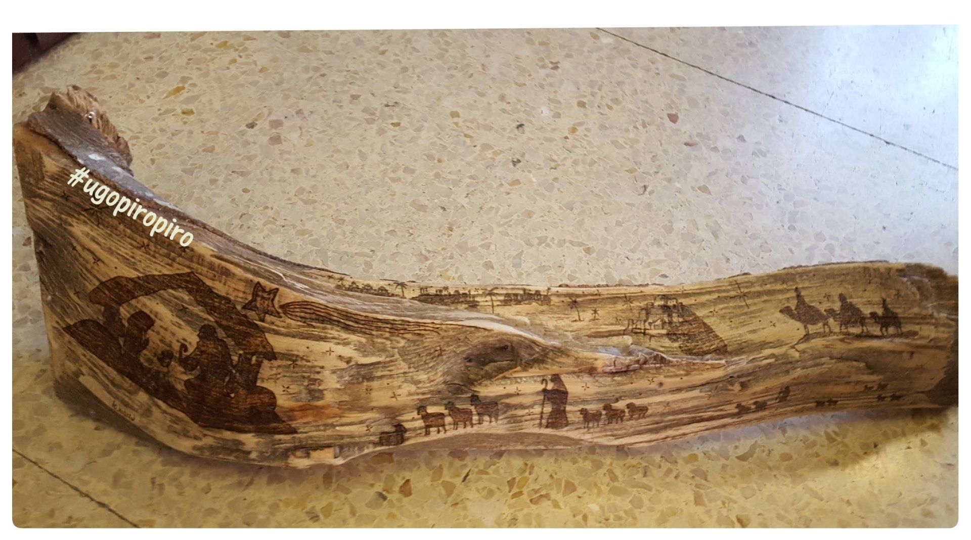 Scena sacra pirografata pirografata su sezione di tronnco trovata in un bosco cm120