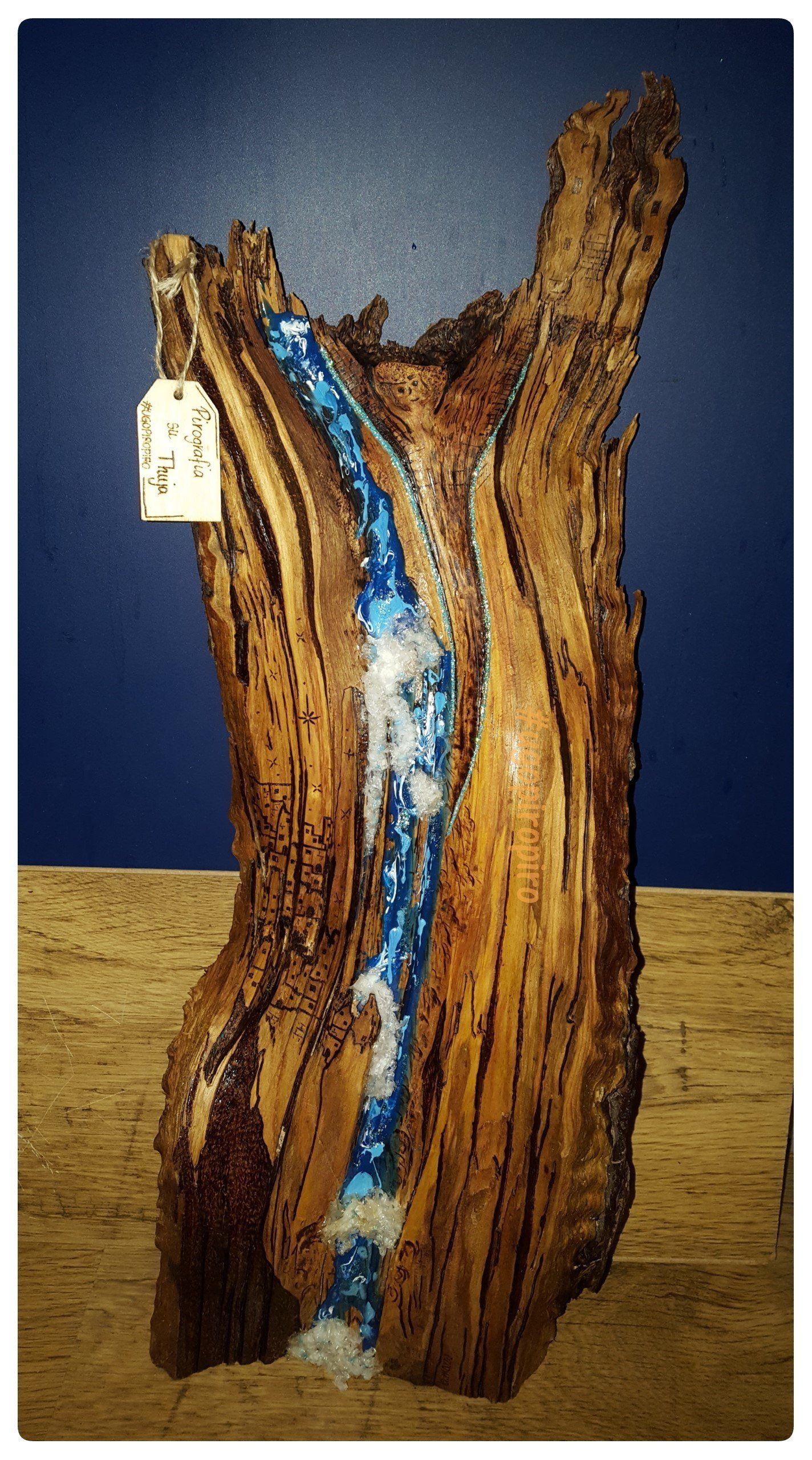 Pirografia su tuja rappresentante lo spirito che esce dalla cascata cm60