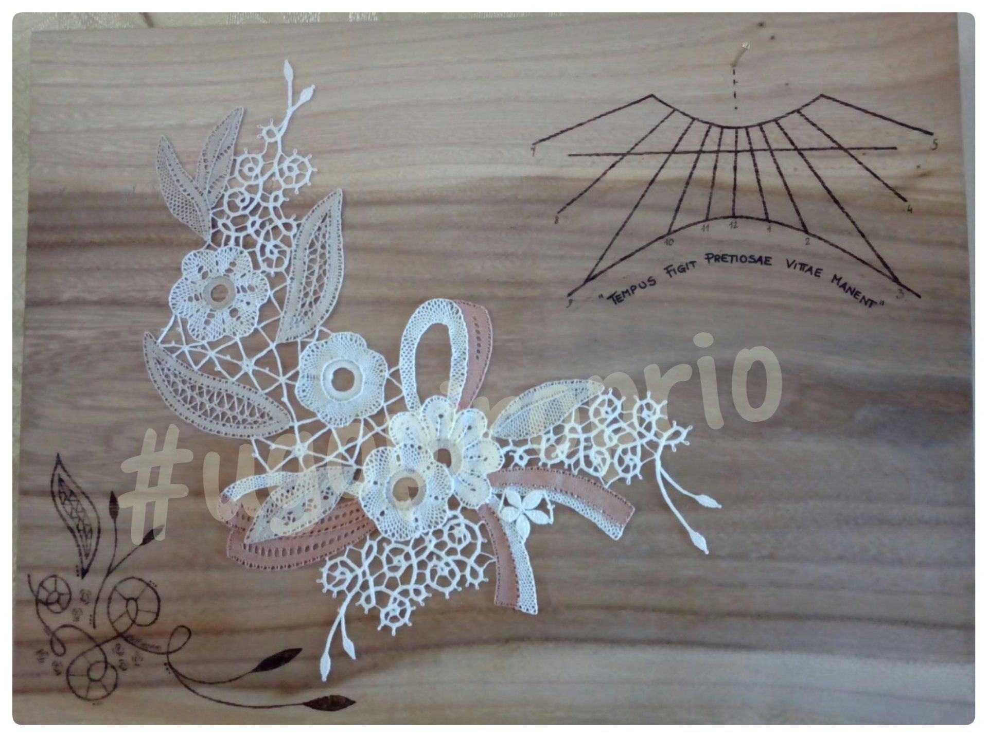 Buttonmeridiana pirografata su una sezione di ciliegio come supporto per tombolo. (cm35x20)
