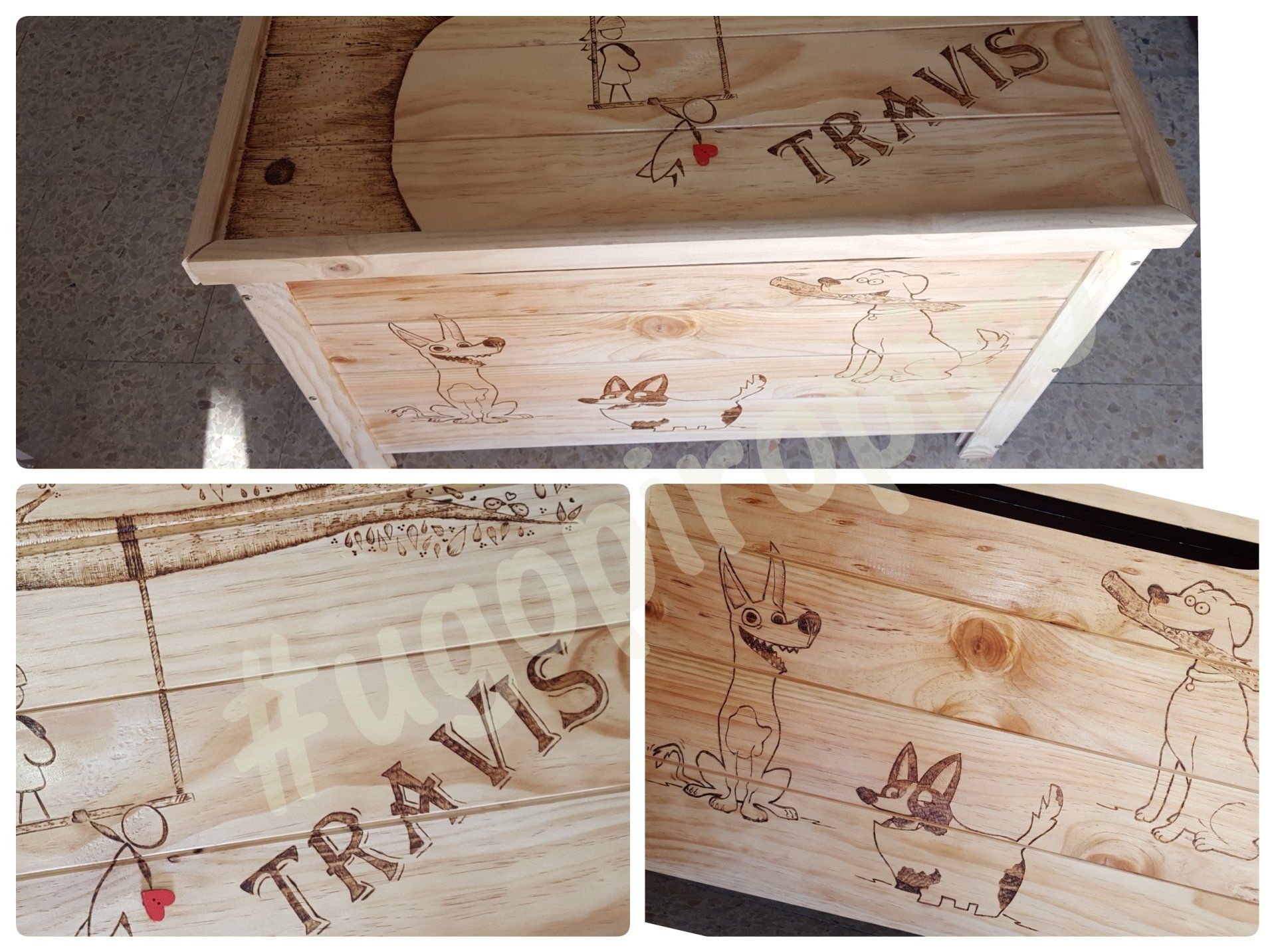 Buttonbox portagiochi per il battesimo del piccolo Samuele, pirografia e acrilico. (cm 100x60x40)